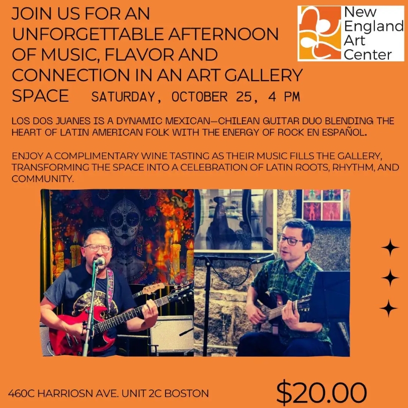 Wine, Music & Connection: Guitar and Latin Rhythms Join us for an unforgettable afternoon of music, flavor, and connection at TAG Art Gallery in the SoWa Arts District! Experience Los Dos Juanes, a dynamic Mexican–Chilean guitar duo blending the soul of Latin American folk with the fire of rock en